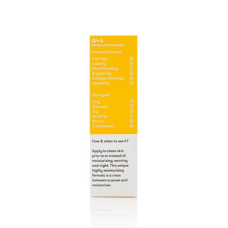 Med et højt niveau af antioxidanter forynger huden, reducerer fine linjer og giver et boost til UV-beskyttelse. Q+A anvender en innovativ indkapslingsmetode, der holder C-vitamin stabilt og effektivt, så huden kan nyde godt af alle fordelene.
