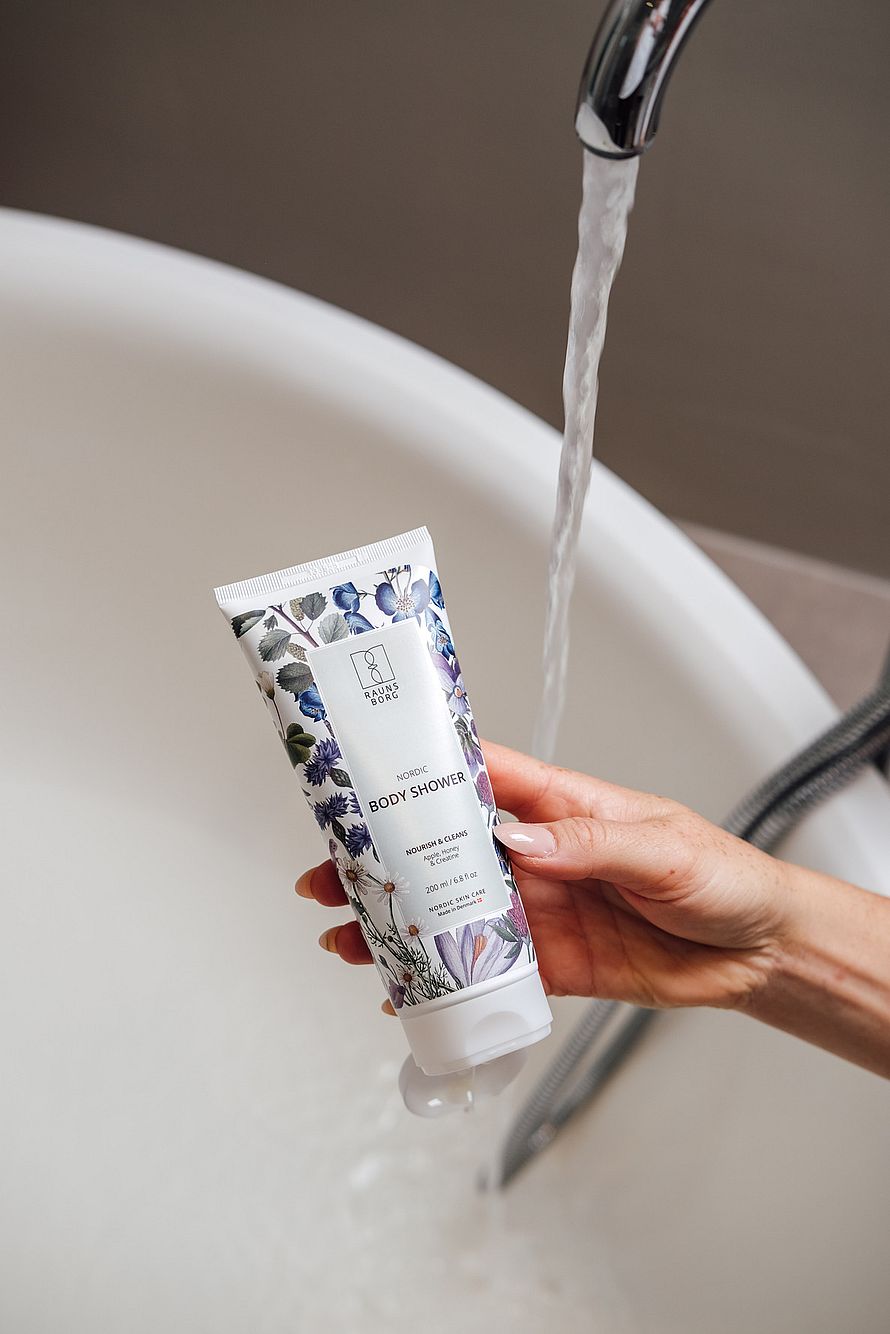 Fugt huden og vask kroppen grundigt med Body Shower. Skyl af med vand.