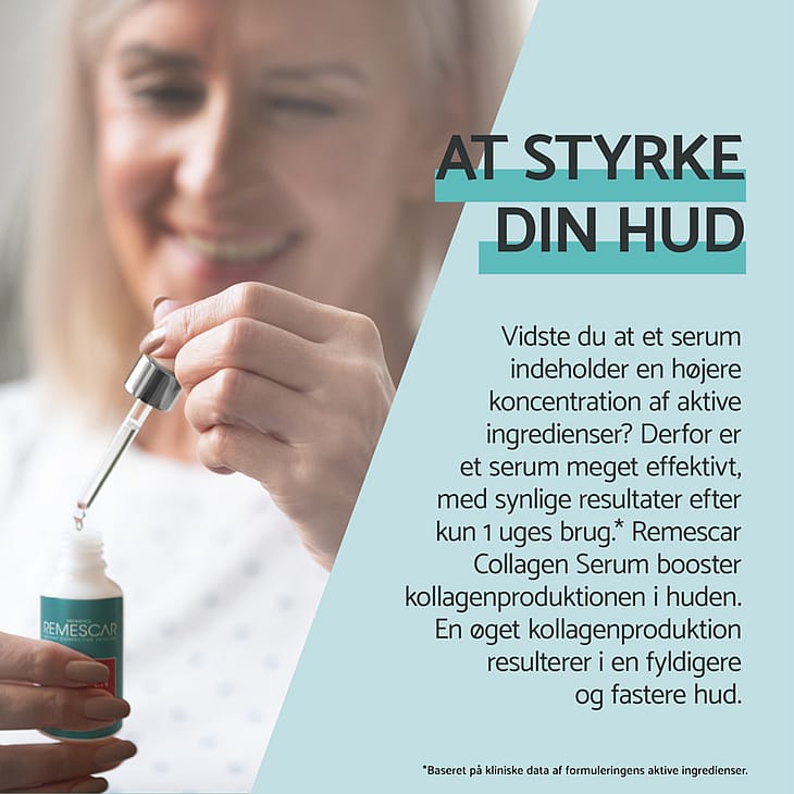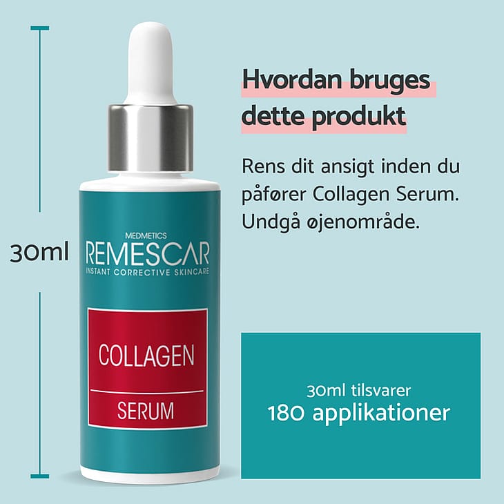 Remescar Collagen Serum har til formål at at genopbygge huden og give den glød. En unik kombination af kollagen og hyaluronsyre kompleks sikre serummet mere elastisk hud.