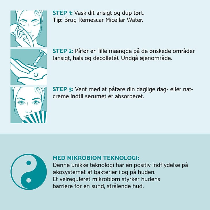 Takket være mikrobiom teknologi genbalancerer Remescars serum hudens mikrobiom. Det genopretter hudens økosystem og den naturlige forsvarsbarriere mod påvirkninger som forurening og stress.