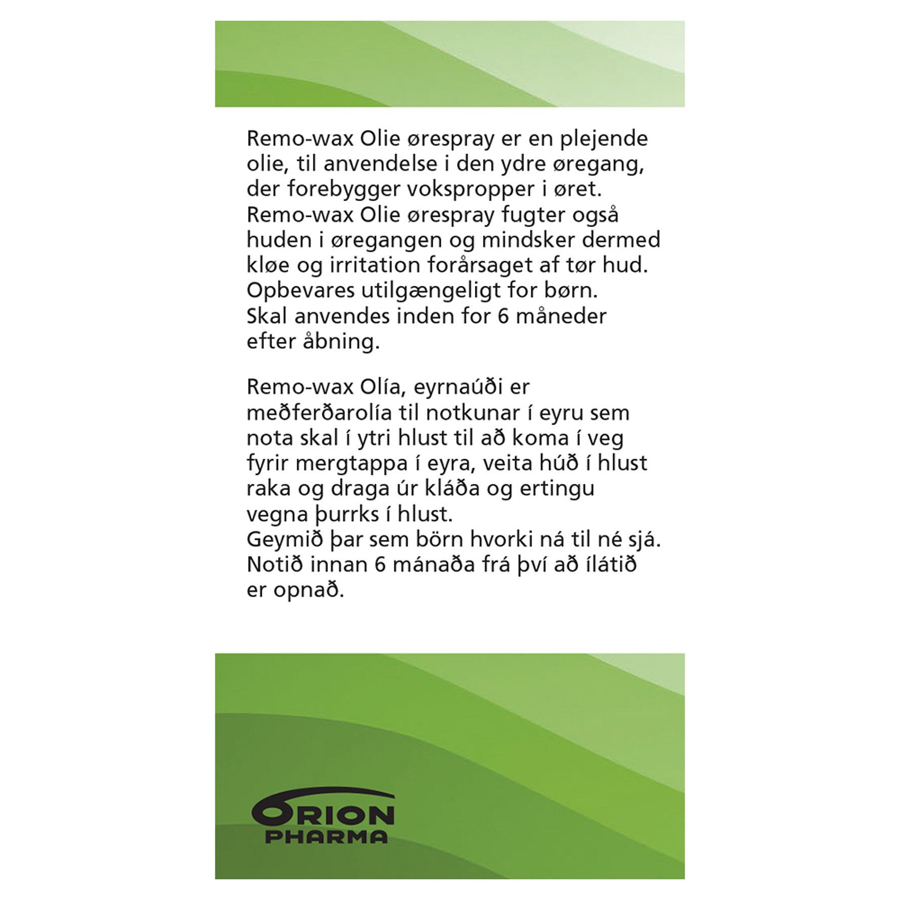 Forebyggelse af ophobning af ørevoks: Spray 1-2 doser af Remo-wax Olie ørespray i øregangen én gang om ugen.
