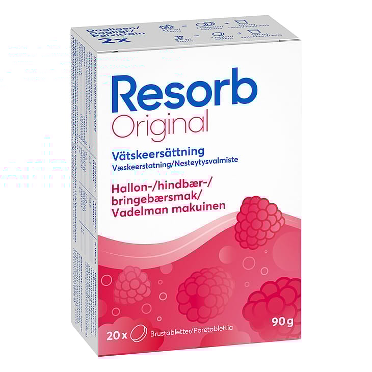 Resorb® Original brusetabletter findes i smagsvarianterne Appelsin, Hindbær, Skovbær og Mango.