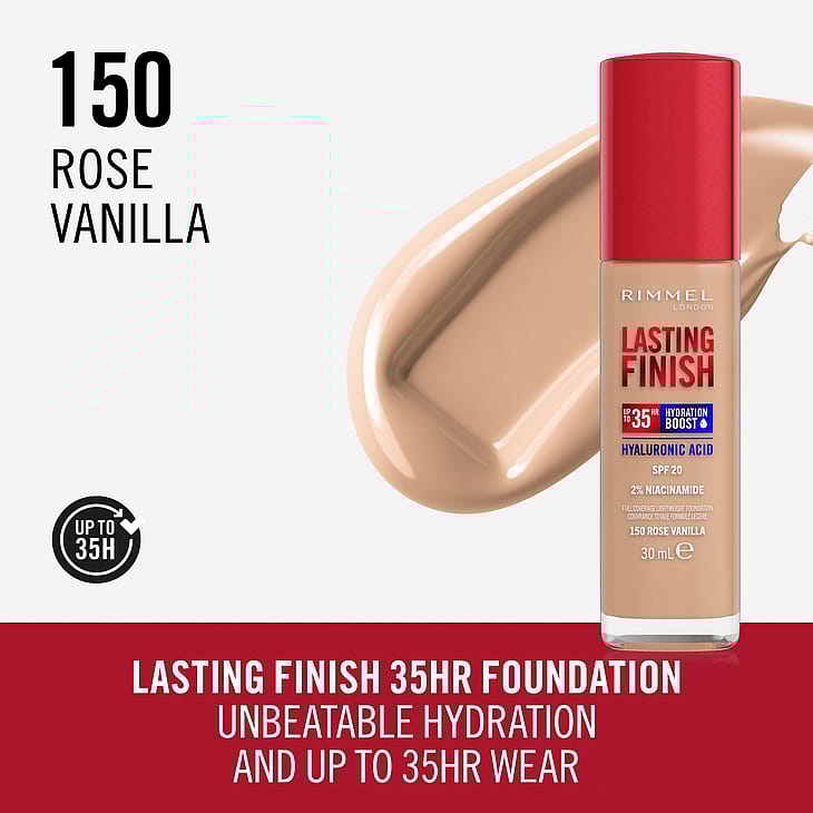 Få uovertruffen fugtighed og op til 35 timers holdbarhed med Rimmel London Lasting Finish 35 Hour Foundation, Rimmels mest fugtgivende long-wear foundation.