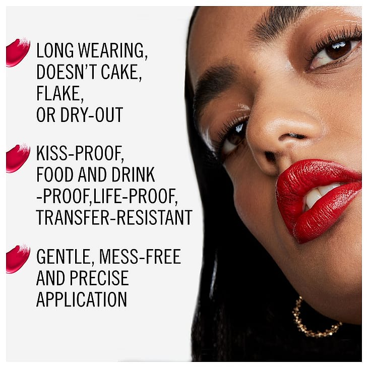 Først en flydende og intens farve og derefter en flydende og fugtgivende topcoat, der sikrer, at læbestiften bliver, hvor den skal.