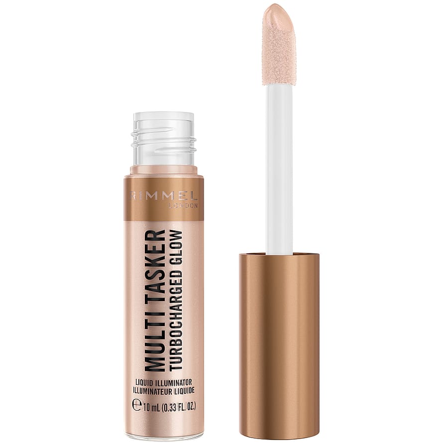 Giv huden øjeblikkelig glød med Rimmel Multi-Tasker Turbocharged Glow Liquid Illuminator – en flydende highlighter beriget med lysreflekterende perlepigmenter samt C- og E-vitamin.