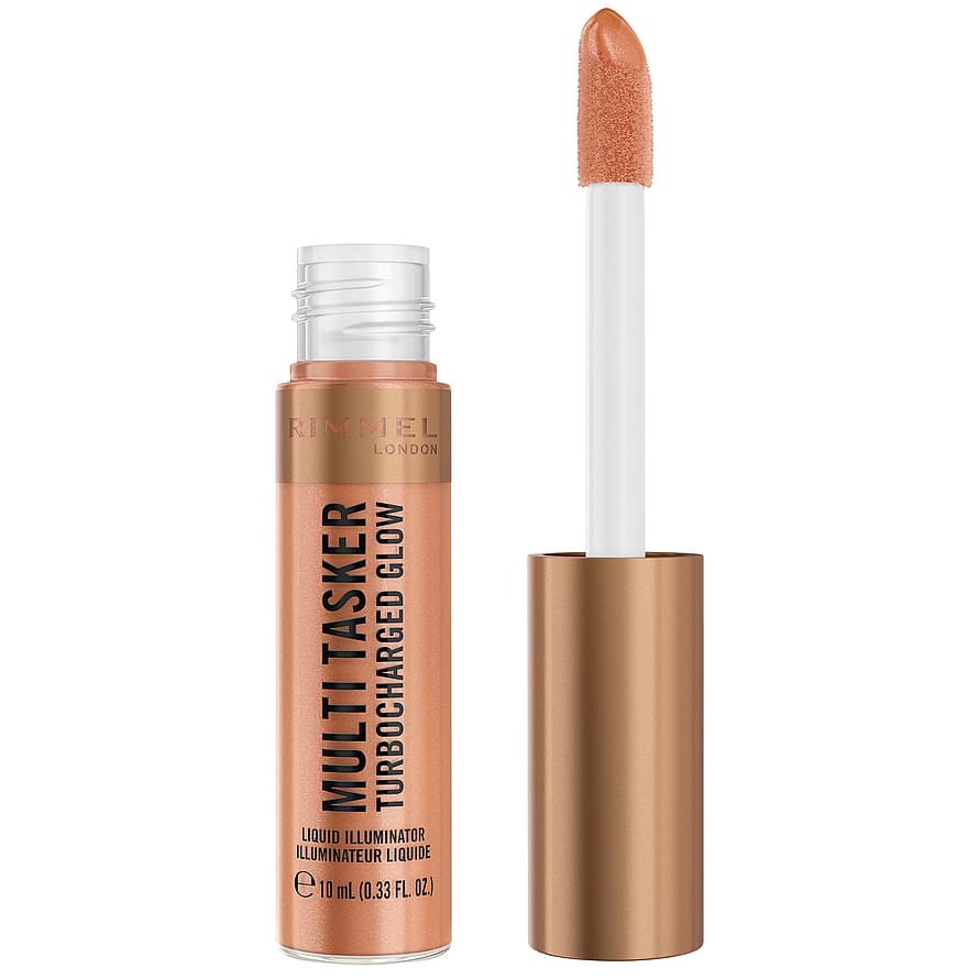 Giv huden øjeblikkelig glød med Rimmel Multi-Tasker Turbocharged Glow Liquid Illuminator – en flydende highlighter beriget med lysreflekterende perlepigmenter samt C- og E-vitamin.