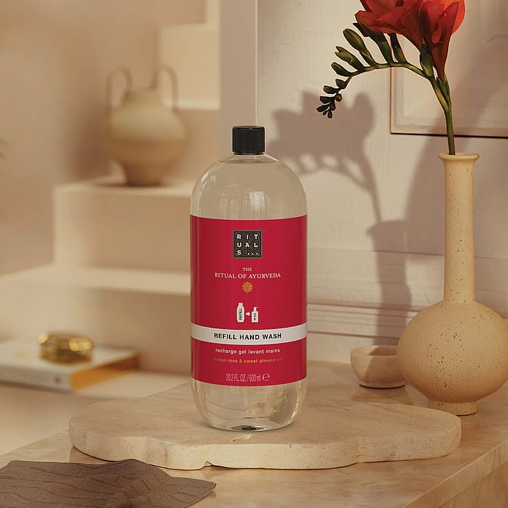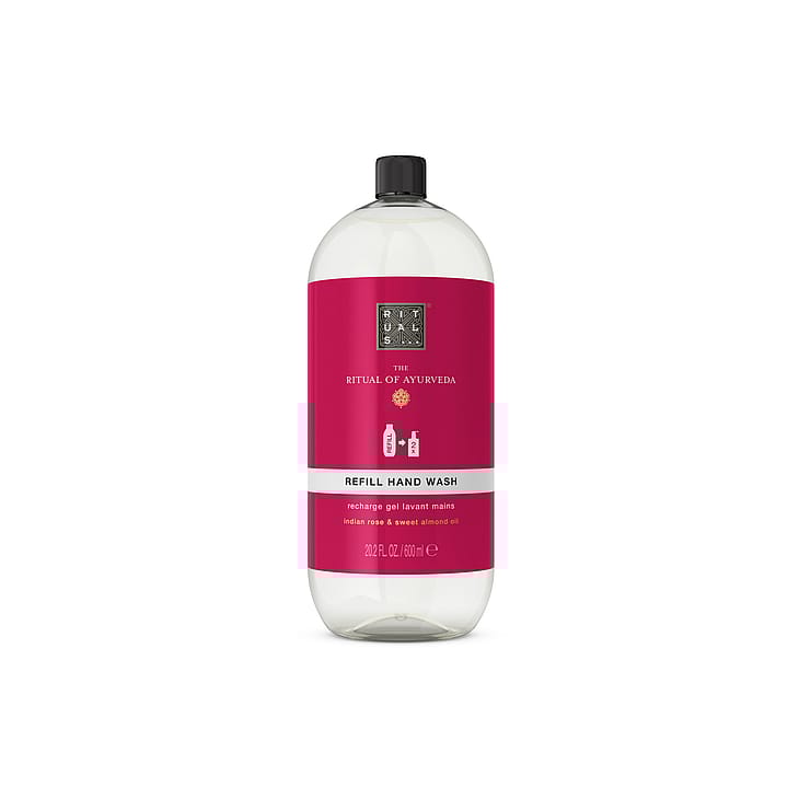 Er det tid til at genopfylde din håndsæbe? Med denne 600 ml refill kan du genopfylde din luksuriøse Rituals håndsæbedispenser to gange! Denne vidunderlige håndsæbe fra The Ritual of Ayurveda er designet til at forvandle en simpel pligt til et fredeligt øjeblik og er beriget med sød mandelolie, den perfekte blødgører for huden, og den beroligende duft af rose. Vores håndsæber er pH-neutrale, så de er skånsomme mod dine hænder, mens de stadig renser grundigt.