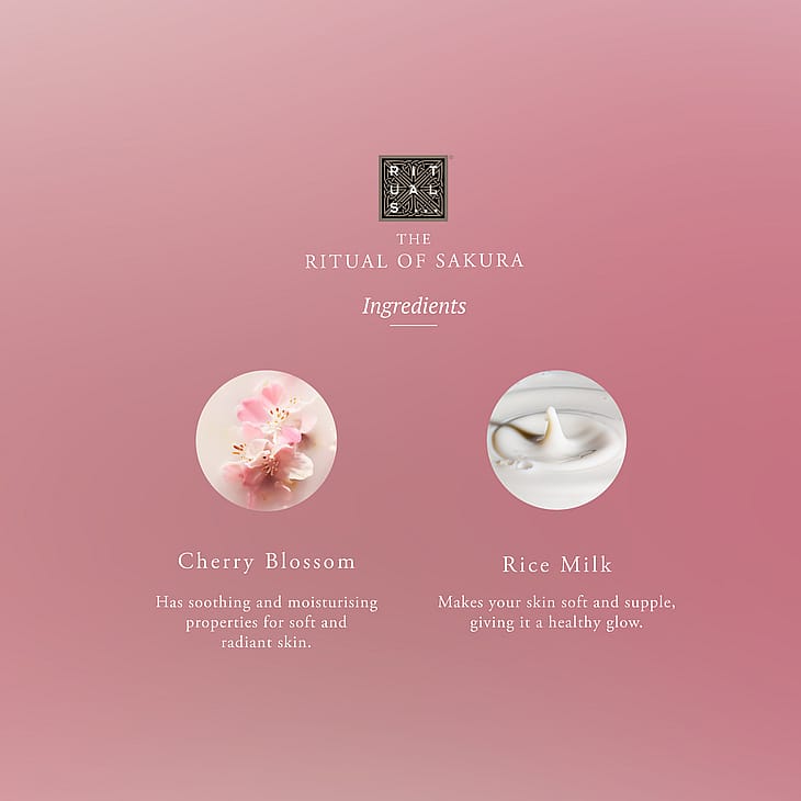 The Ritual of Sakura Scented Candle: See WARNINGThe Ritual of Sakura Mini Fragrance Sticks: See WARNINGThe Ritual of Sakura Foaming Shower Gel: Aqua/Water, Sodium Coco-Sulfate, Decyl Glucoside, Isopentane, Coco-Glucoside, Glycerin, Parfum/Fragrance, PEG-120 Methyl Glucose Dioleate, Isobutane, Isopropyl Palmitate, Oryza Sativa (Rice) Extract, Prunus Serrulata (Cherry) Flower Extract, Citric Acid, Sodium Benzoate, Hexyl Cinnamal, Guar Hydroxypropyltrimonium Chloride, Benzyl Salycilate, Linalool, Coumarin, Citronellol, Geraniol, Alpha-Isomethyl Ionone, Cinnamyl Alcohol, Tocopherol, Potassium Sorbate, Sodium Citrate, Sorbic Acid.The Ritual of Sakura Body Cream: Aqua/Water, Cetearyl Alcohol, Glycerin, Caprylic/Capric Triglyceride, Propylheptyl Caprylate, Undecane, Helianthus Annuus (Sunflower) Seed Oil, Prunus Avium (Sweet Cherry) Fruit Extract, Oryza Sativa (Rice) Extract, Centella Asiatica Leaf Extract, Allantoin, Ubiquinone, Tocopherol, Tocopheryl Acetate, Propylene Glycol, Caprylyl Glycol, Carbomer, Sodium Polyacrylate, Ceteareth-20, Glyceryl Stearate, Ceteareth-12, Cetyl Palmitate, Tridecane, Isohexadecane, Butylene Glycol, Sodium Citrate, Parfum/Fragrance, Benzyl Salicylate, Cinnamyl Alcohol, Citral, Citronellol, Coumarin, Geraniol, Hexyl Cinnamal, Isoeugenol, Linalool, Alpha-Isomethyl Ionone, Limonene, Phenoxyethanol, Potassium Sorbate, Sodium Metabisulfite, Sorbic Acid, Citric Acid, Sodium Hydroxide.