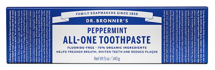 Dr. Bronner's Peppermint All-One-tandpasta er naturlig og vegansk, uden kunstige farver, sødestoffer og konserveringsmidler.