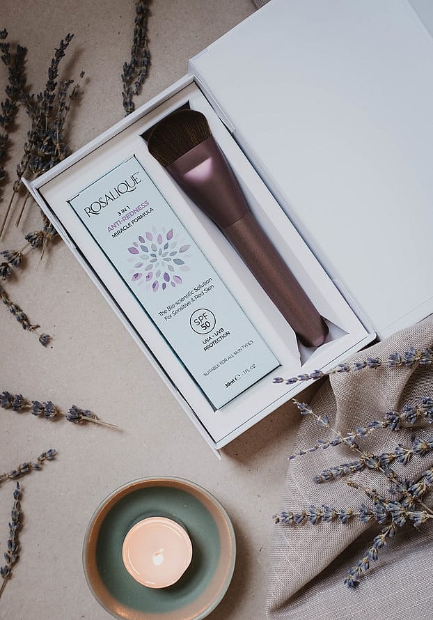 Når børsten bruges sammen med Rosalique 3-i-1 anti-rødme creme, oplever man den fantastiske effekt, af de tætte børstehår, som nænsomt ”buffer” produktet rundt på huden, og giver en flot ensartet dækkeevne.