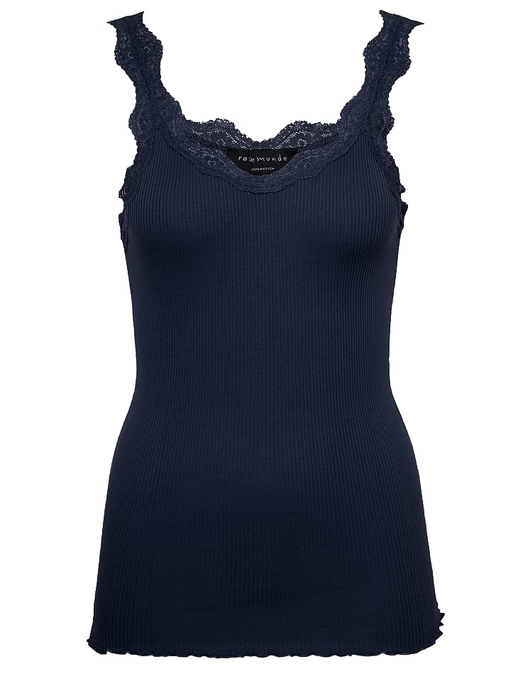 Rosemundes øko bomuld top er ekstra blød og behagelig designet med en feminin blondekant langs den runde halsudskæring.