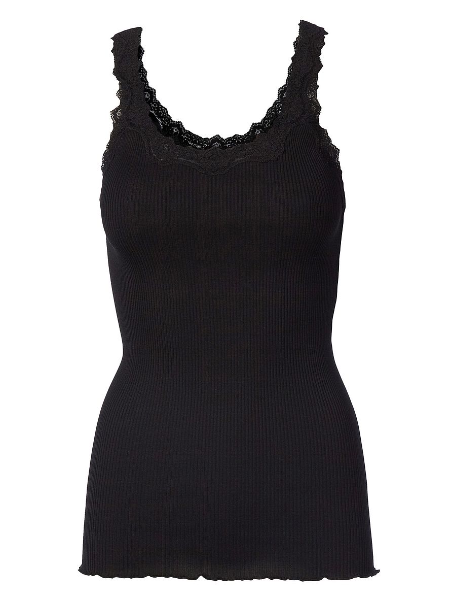 RWBabette Silk SL Deep Back Lace Top er en feminin og elegant top i en ribbet silkekvalitet, designet med rund hals, fine blondestropper og en dyb rygudskæring.