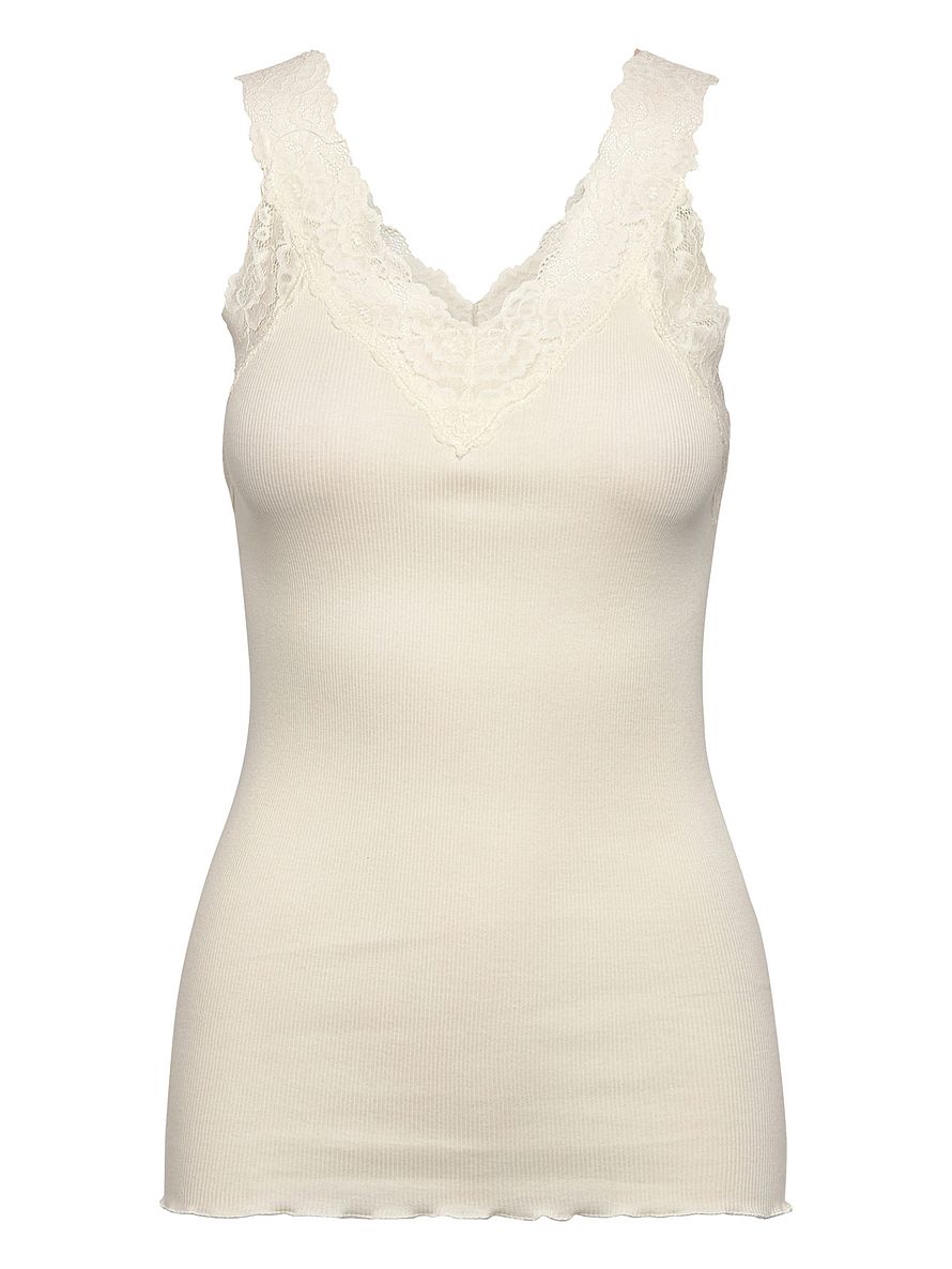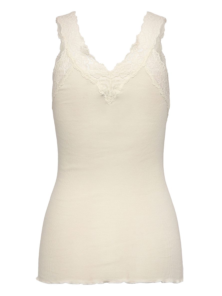Denne top i økologisk bomuld er designet med fine brede blondedetaljer ved v-halsudskæring og krølkant. Den er lavet af 100% økologisk bomuld og er meget blød at have på.