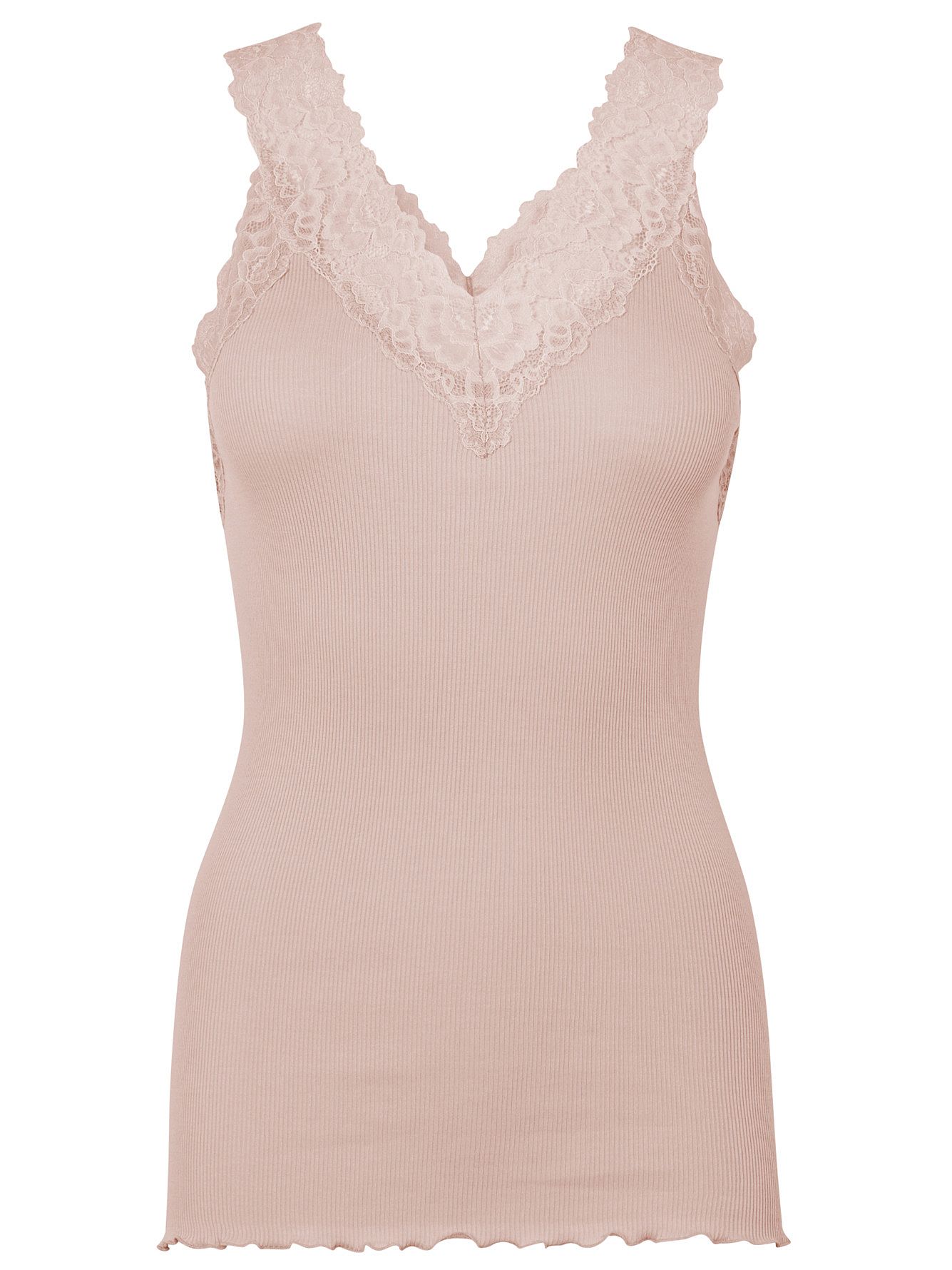 Denne top i økologisk bomuld er designet med fine brede blondedetaljer ved v-halsudskæring og krølkant. Den er lavet af 100% økologisk bomuld og er meget blød at have på.