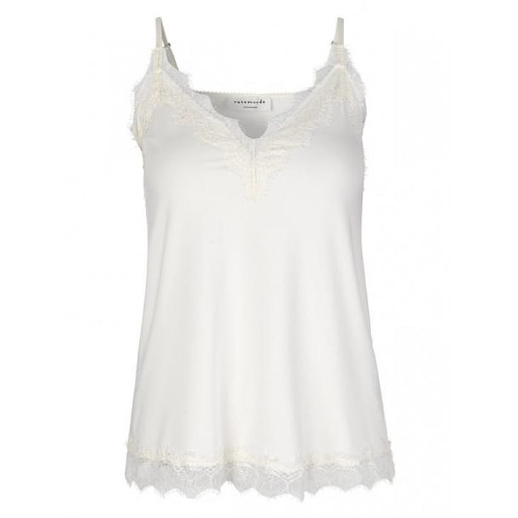 Feminin stroptop med V-udskæring og justerbare stropper i blødt materiale fra Rosemunde. Toppen er designet med smukke blonder foroven og forneden.