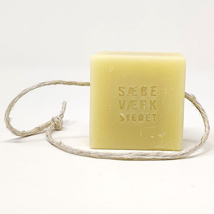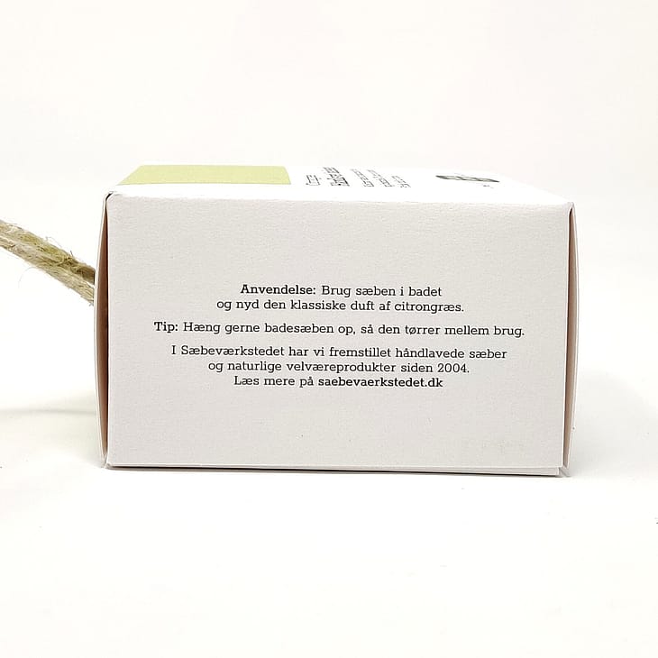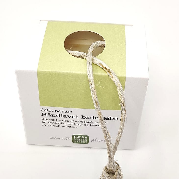 Sæben er fremstillet af økologisk oliven- og kokosolie og den dufter friskt og aromatisk af æterisk olie af Citrongræs. Sæben hænger på en hampsnor, så den holder sig tør og varer længe
