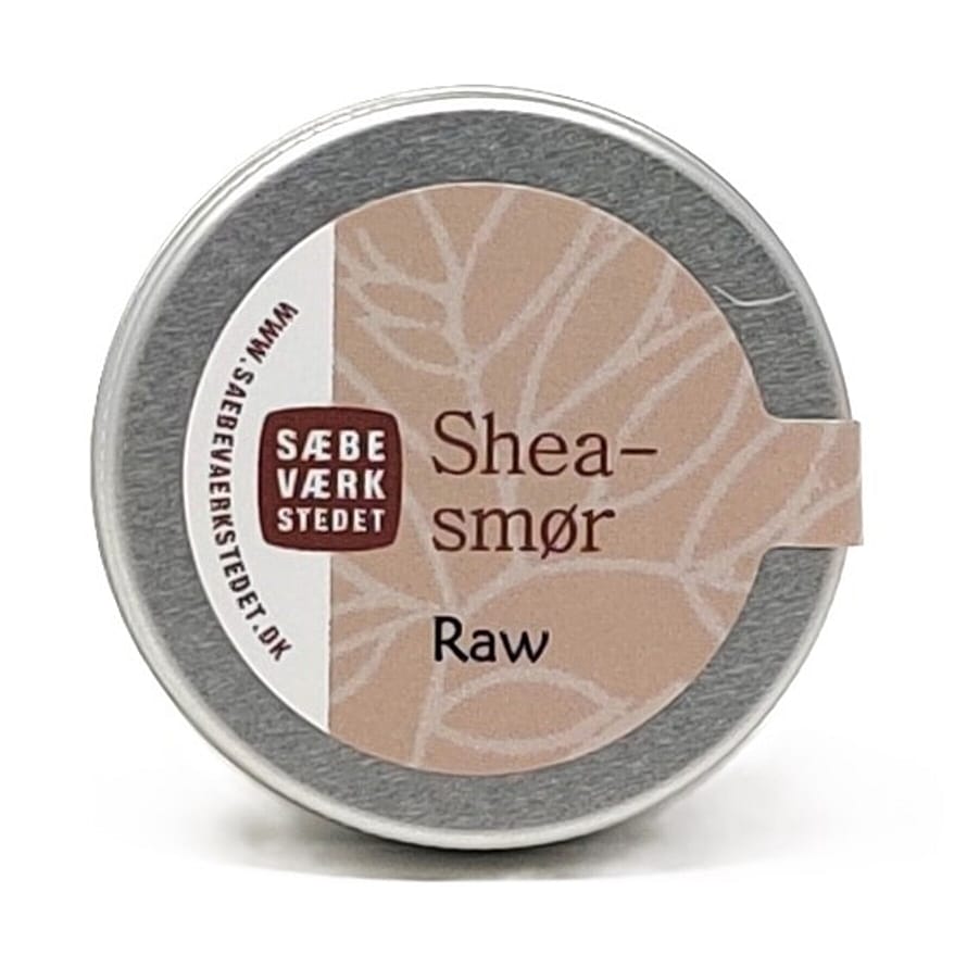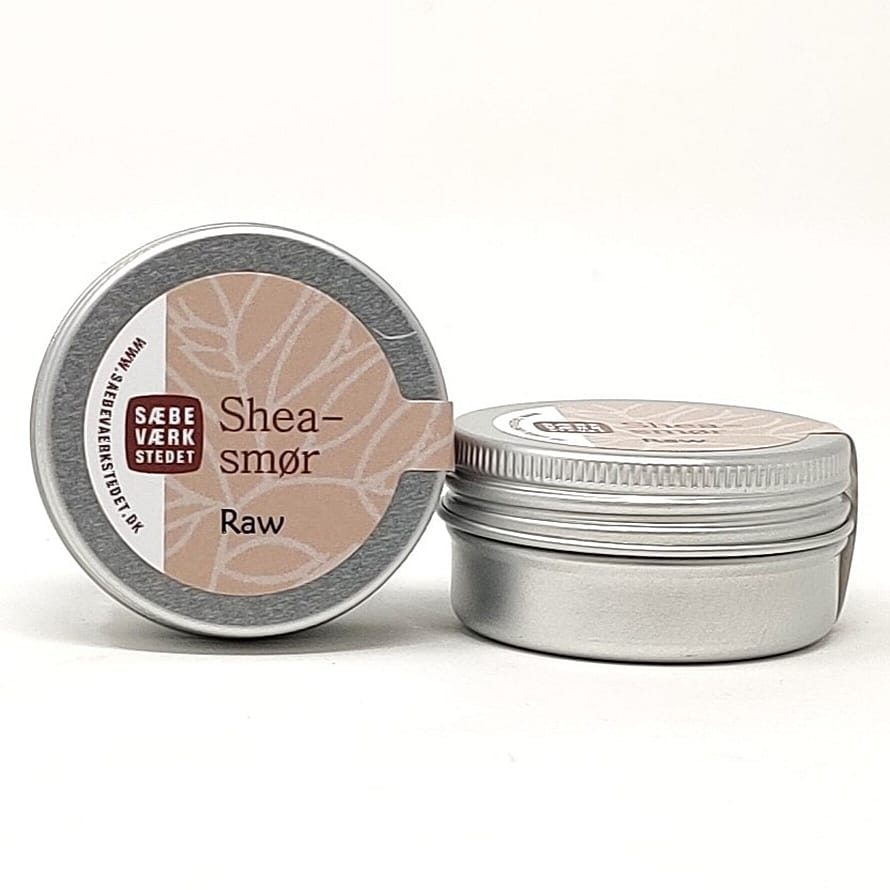 Økologisk sheasmør plejer og beskytter og kan anvendes til stort set alt fra tørre læber til tør eller irriteret hud. Her i lille 14 g. dåse, der er bekvem at have med