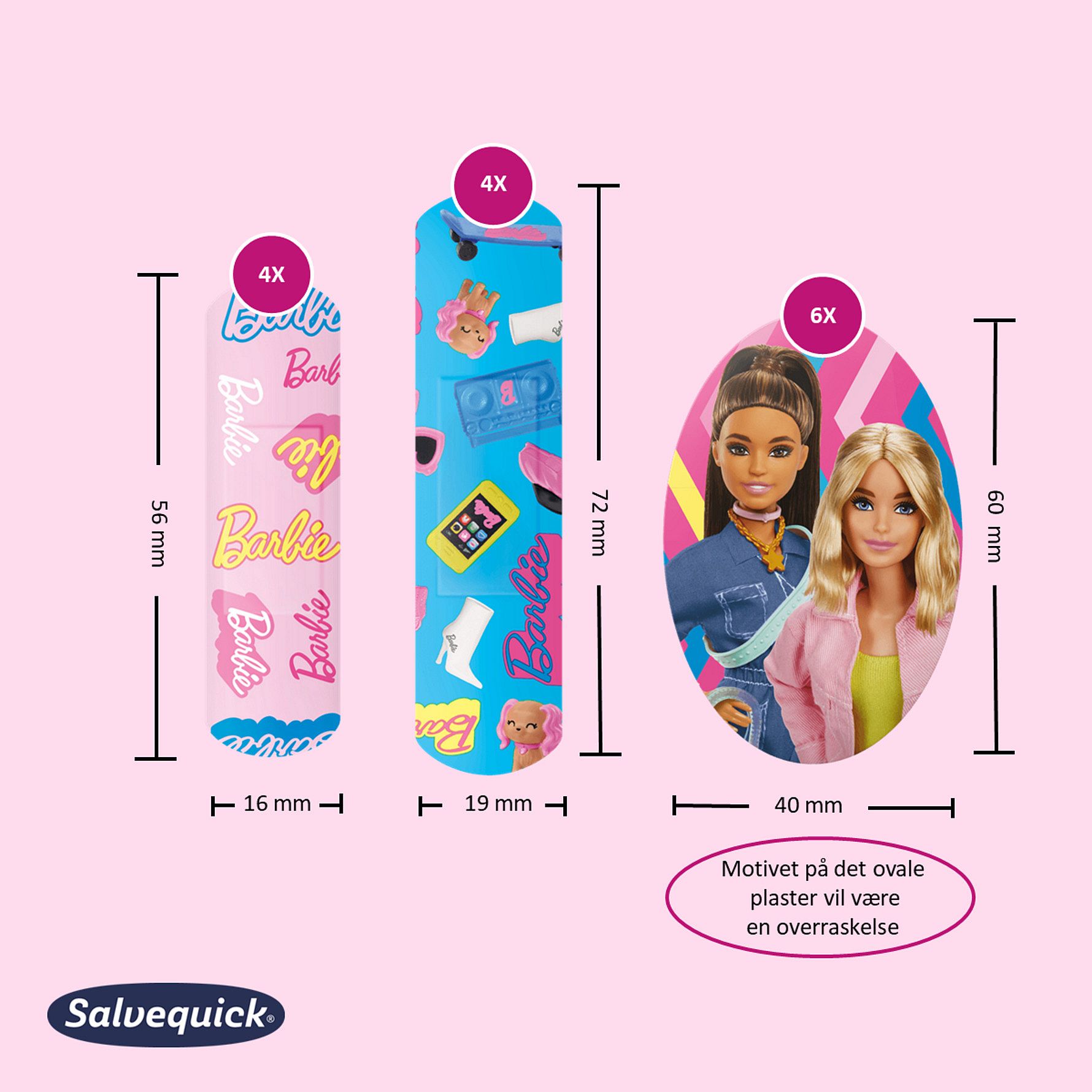 Børneplaster med populært motiv, som indeholder farverige og glade Barbies. Perfekt til at hjælpe forældre, når barnet har brug for et plaster. - vandafvisende - smudsafvisenede - åndbart materiale - Fleksibelt og holdbart materiale - 3 forskellige størrelser i pakken - Indeholder bl.a. et ovalt plaster Medicinsk udstyr