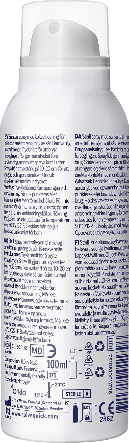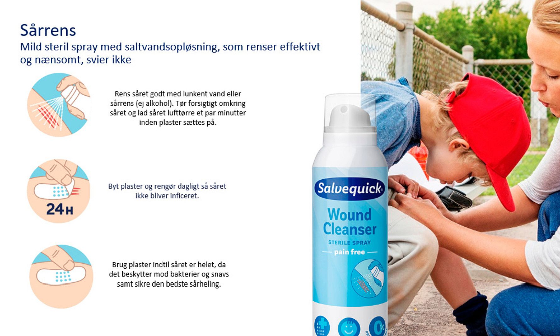 Salvequick sårrens er en steril spray med saltvand til mild og smertefri rengøring af sår.