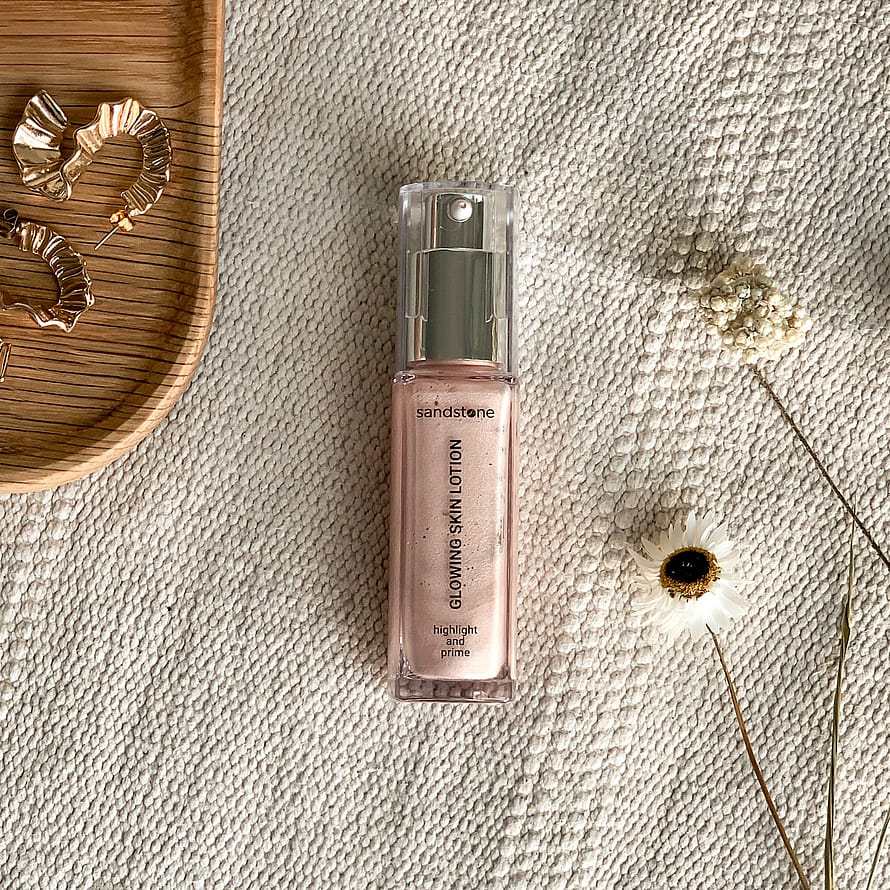 Sandstone Glowing Skin Lotion er en strålende primer og lotion, der giver din hud et glødende, friskt look. Den kan bruges både som primer under foundation, som highlighter på kindbenene eller mixes i din foundation eller dagcreme for at give mere glød.