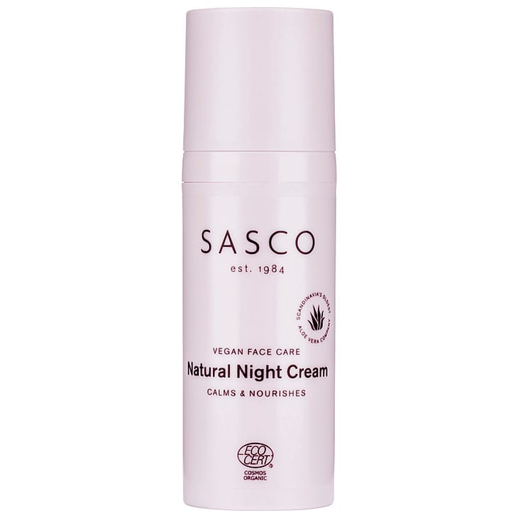 Sasco Natural Night Cream er en intenst plejende natcreme, der er rig på økologisk aloe vera og blødgørende olier fra avocado og solsikke.