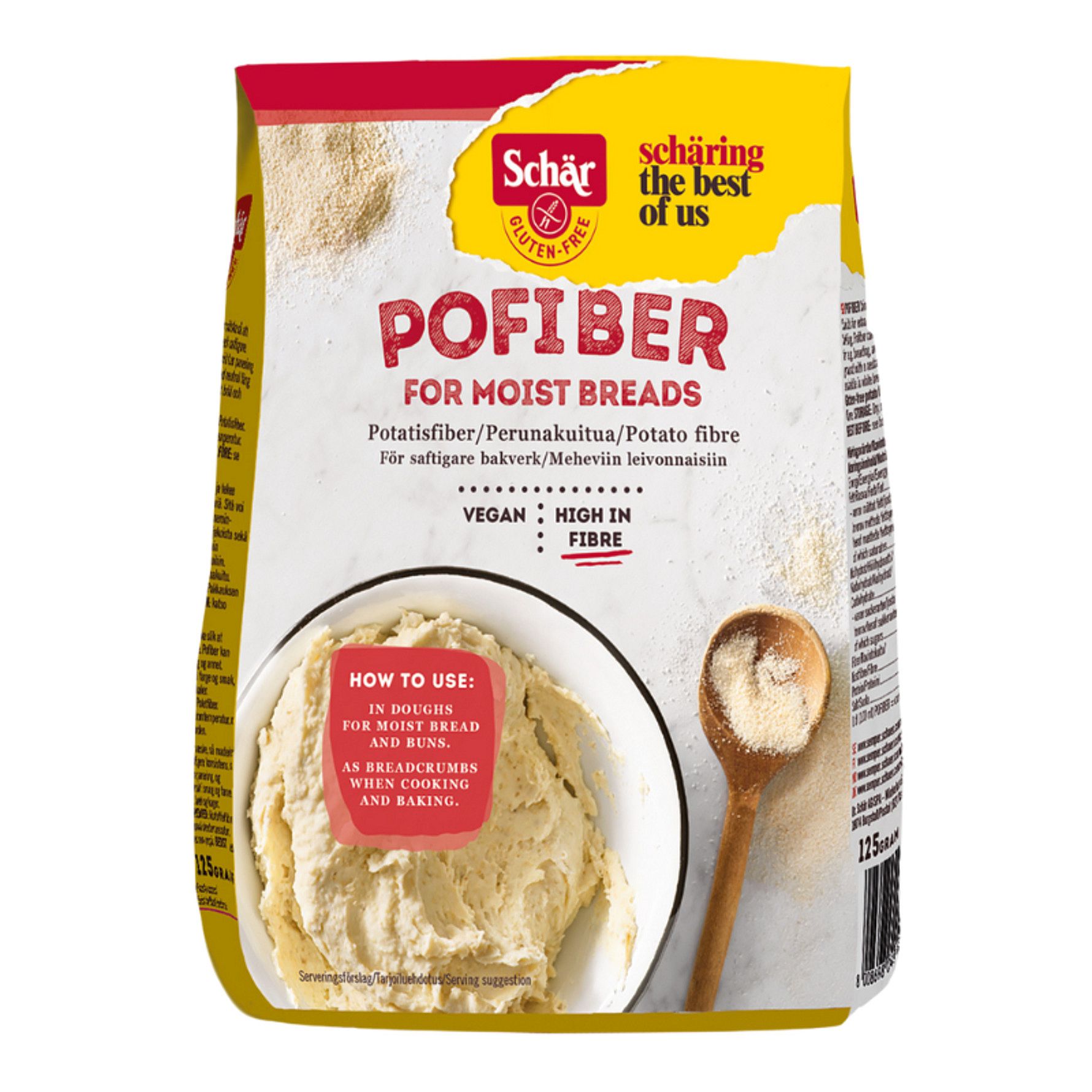 Glutenfri PofiberSamme indhold og smag som før, men nu i varemærket Schär. Glutenfri Pofiber fra Schär– bagehjælpemiddel til saftigere brød. Pofiber er et findelt fibermel, der effektivt binder store mængder væske. Den kan bruges til glutenfri bagning til fastere deje og saftigere brød og i retter hvor der skal bruges rasp fx til panering. Pofiber fremstilles af svenske kartofler ved en særlig produktionsmetode, hvor kartoflens frugtkød renses og tørres. Schärs Pofiber har desuden et højt fiberindhold.