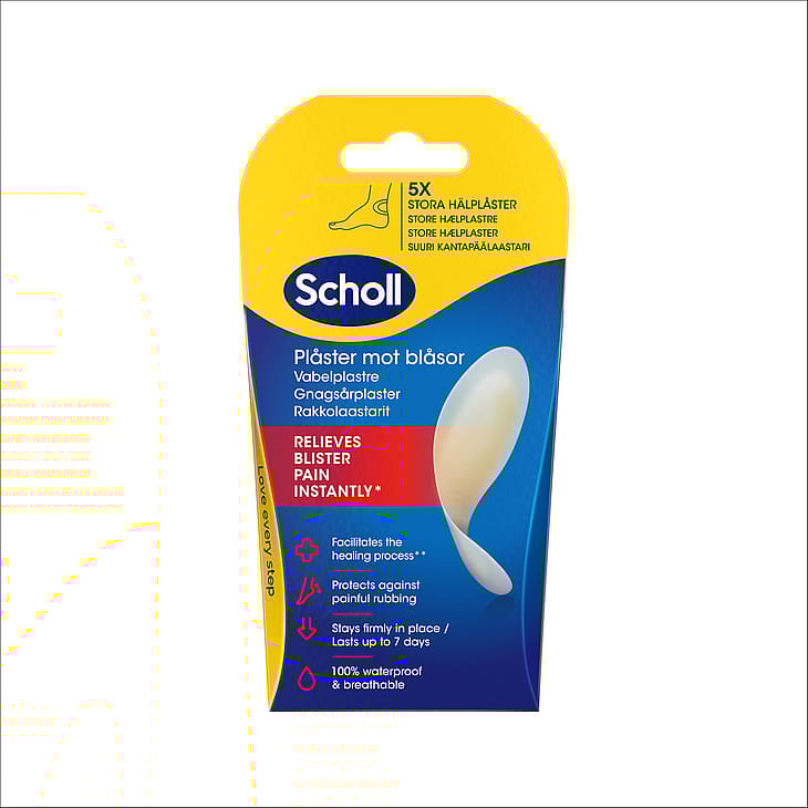 SMERTELINDRING - Sår, hvor sko kan gnide eller vabler, der allerede er dannet ved at gå i lang tid, kan klædes på med et Scholl-plaster for at give øjeblikkelig lindring af smertefulde vabler.