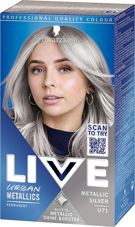 Hårfarve fra Schwarzkopf - LIVE Intense Colour Urban Metallics U71 Silver Chrome er en permanent sølv hårfarve med effektiv glansforstærker for maksimal farvedybde og en metallisk glansfuld finish.