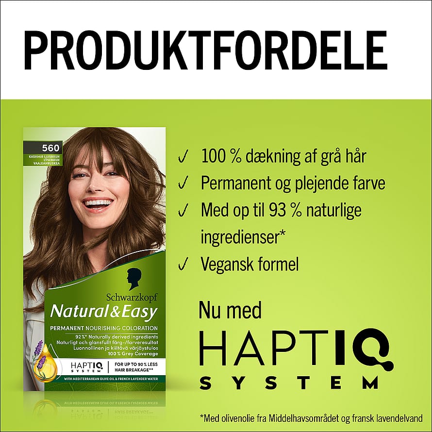Hårfarven giver 100% dækning af grå hår, så de er nemme at dække. Hårfarven er også vegansk og fri for animaliske ingredienser, med op til 93%* ingredienser af naturlig oprindelse, der fremhæver en naturlig hårfarve. Vil du også have en plejende hårfarve? Den medfølgende balsam med olivenolie fra Middelhavet indeholder 97%* ingredienser af naturlig oprindelse, hvilket giver dig et smukt og skinnende hår.
