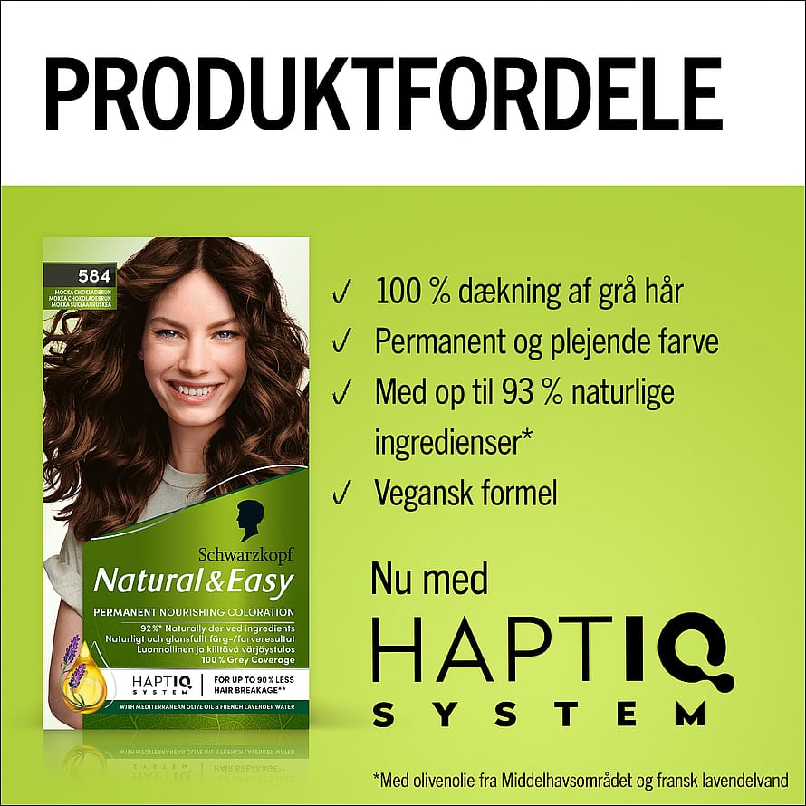 Hårfarve fra Schwarzkopf - Natural & Easy 584 Mokka Chokoladebrun er en permanent hårfarve, specielt udviklet til dig, der ønsker at farve håret hjemme og få en naturlig chokoladebrun hårfarve med mørke undertoner. Den plejende formel med fransk lavendelvand indeholder 3 færdigblandede nuancer, hvilket giver dig et smukt og naturligt farve resultat.