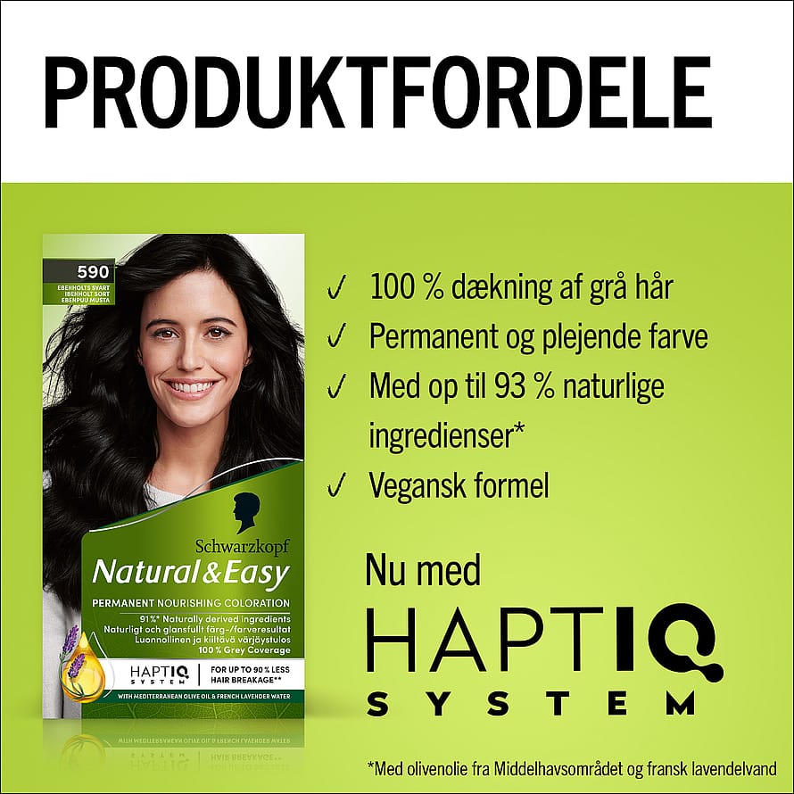 Hårfarve fra Schwarzkopf - Natural & Easy 590 Ibenholt Sort er en permanent hårfarve, specielt udviklet til dig, der ønsker at farve håret hjemme og få en naturlig sort hårfarve.