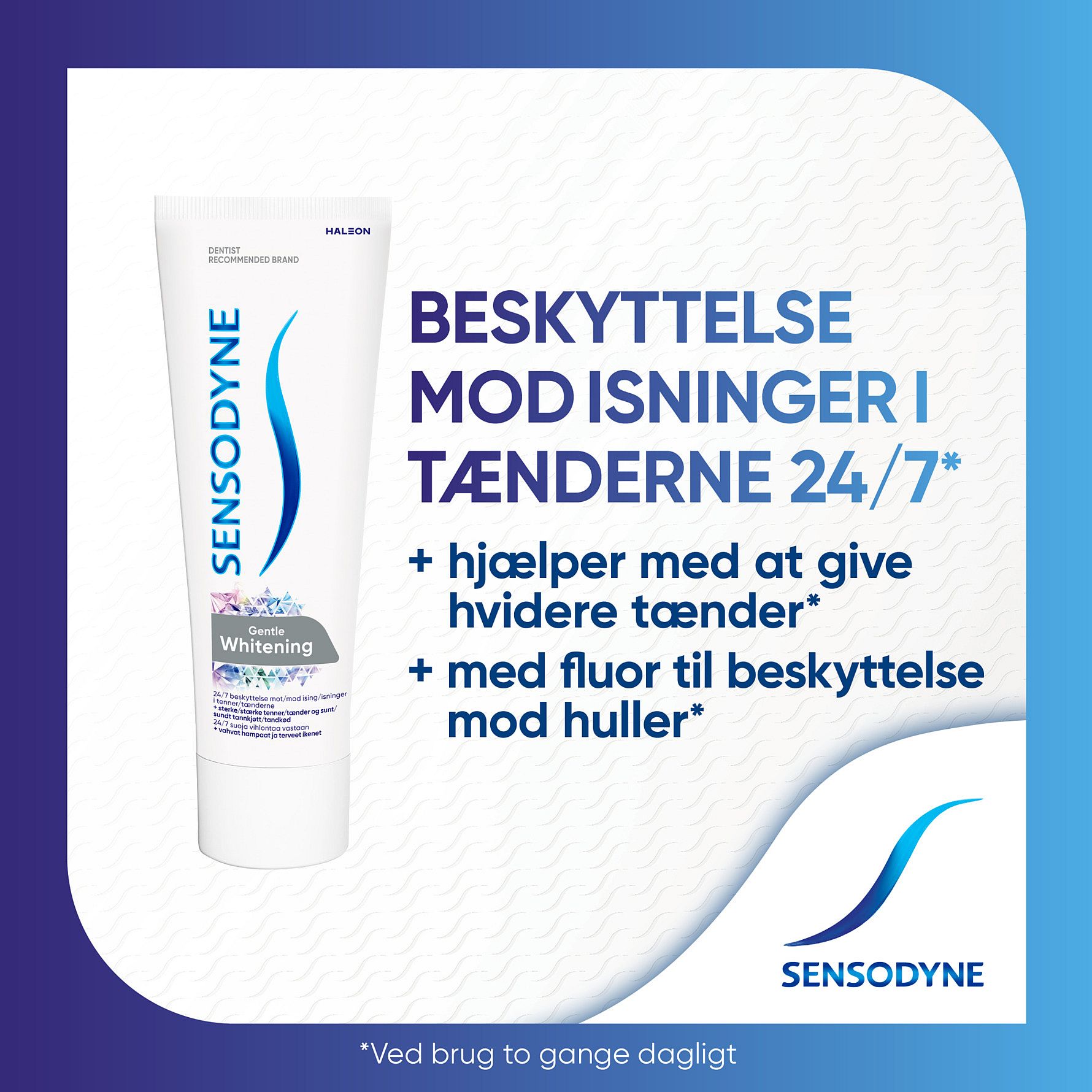 Ved tandbørstning to gange om dagen med Sensodyne Gentle Whitening får du en tandpasta der: