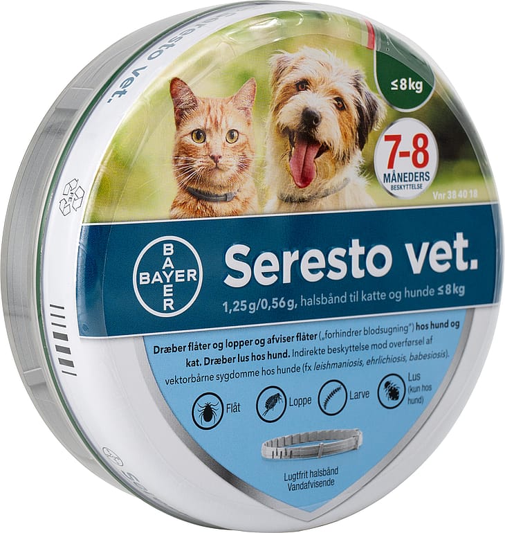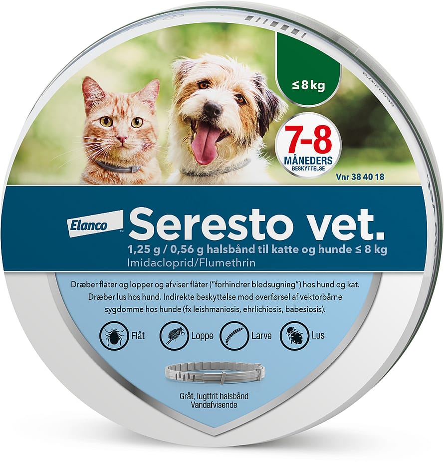 Seresto vet., halsbånd til katte og hunde = 8 kg (1,25 g imidacloprid og 0,56 g flumethrin)Seresto vet., halsbånd til hunde > 8 kg (4,5 g imidacloprid og 2,03 g flumethrin).Indikationer: Til behandling og forebyggelse af loppeangreb hos hunde og katte i 7-8 måneder. Beskytter i dyrets nære omgivelser mod udvikling af loppelarver i 10 uger hos katte og 8 måneder hos hunde. Seresto vet. kan anvendes som en del af behandlingsstrategien ved loppeallergibetinget hudbetændelse. Seresto vet. har en vedvarende acaricid (dræbende) virkning mod flåter og repellerende (forhindrer blodsugning) virkning mod flåter hos hund og kat i 8 måneder. Produktet er virksomt mod larver, nymfer og voksne flåter. Produktet giver en indirekte beskyttelse mod overførsel af visse parasitter og bakterier fra flåter. Hermed mindskes risikoen for babesiose og ehrlichiose hos hunde i 7 måneder.Reducerer risikoen for infektion med Leishmania infantum ved overførsel via sandfluer i op til 8 måneder hos hunde.Til bekæmpelse af angreb af bidende lus hos hunde. Kontraindikationer: Killinger under 10 uger og hvalpe under 7 uger må ikke behandles. Bør ikke anvendes i tilfælde af overfølsomhed over for de aktive stoffer eller et eller flere af hjælpestofferne.Advarsler og forsigtighedsregler: Sæsonbetinget fældning kan føre til en forbigående mindre reduktion af virkningen pga. tab af aktivt stof bundet i pelsen. Ny fordeling fra halsbåndet sker omgående, så fuld virkning vil blive genetableret uden yderligere behandling eller skift af halsbåndet. Produktet er vandafvisende, og virker selv hvis dyret bliver vådt. Dog bør dyret ikke udsættes for store mængder vand i længere tid eller hyppig vask med shampoo, da virkningstiden dermed kan nedsættes. Små børn må ikke lege med halsbåndet eller putte det i munden. Kæledyr, der bærer halsbåndet, bør ikke sove sammen med deres ejere, især ikke børn. Imidacloprid og flumethrin frigives kontinuerligt fra halsbåndet til hud og pels, så længe halsbåndet bæres. Halsbåndet kan udløse overfølsomhedsreaktioner hos visse personer. Personer med kendt overfølsomhed (allergi) over for stofferne i halsbåndet, bør undgå kontakt med halsbåndet. Halsbåndet kan i meget sjældne tilfælde give irritation på hud, i øjne og luftveje. Ved øjenirritation skylles disse grundigt med koldt vand. Ved hudirritation vaskes huden med koldt vand og sæbe. Varer symptomerne ved anbefales det at søge læge. Vask hænderne med koldt vand efter at have fastgjort halsbåndet. Bivirkninger: Hos dyr, der ikke er vant til at bære halsbånd, kan adfærdsændringer, som f.eks. at gemme sig, vokalisering, hyperaktivitet, overdreven slikning og/eller pelspleje og kradsen omkring halsbåndet, i sjældne tilfælde forekomme, i de første dage efter halsbåndet er sat på. I meget sjældne tilfælde er aggression set, efter at halsbåndet er sat på. Kontrollér, at halsbåndet sidder korrekt. Kløe, hudrødme og hårtab omkring halsbåndet kan opstå. Dette er sjældent hos hund og ualmindeligt hos kat. I enkelte tilfælde kan det tilrådes midlertidigt at fjerne halsbåndet, indtil symptomerne er forsvundet. I meget sjældne tilfælde hos hund og i sjældne tilfælde hos kat kan opstå reaktioner som hudbetændelse, betændelseslignende tilstand, eksem, hudlæsioner eller blødning omkring halsbåndet, og det anbefales at halsbåndet fjernes. I sjældne tilfælde kan neurologiske symptomer så som ataksi, kramper og tremor forekomme hos hunde og det anbefales at halsbåndet fjernes. Hos hunde og katte kan der i starten, i sjældne tilfælde, ses lette og forbigående reaktioner så som depression, ændret spisemønster, savlen, opkast og diarré. Hos overfølsomme dyr kan der opstå kontakteksem.Drægtighed og laktation: Lægemidlets sikkerhed under drægtighed og diegivning er ikke fastlagt hos hunde og katte. Det anbefales derfor ikke at bruge produktet til drægtige eller diegivende hunkatte og tæver.Dosering: Katte og små hunde på op til 8 kg kropsvægt skal bruge et halsbånd på 38 cm. Hunde på over 8 kg skal bruge et halsbånd på 70 cm. Ét halsbånd pr. dyr fastgøres om halsen. Kun til udvortes brug. Det anbefales at fjerne eventuelle flåter, når halsbåndet påføres, da disse ikke nødvendigvis dræbes inden for 48 timer. Forebyggelsen af nye flåtangreb sker inden for 2 dage efter påføring af halsbåndet.Pakningsstørrelser: Seresto vet. til katte og hunde = 8 kg: 1 halsbånd, Seresto vet. til hunde > 8 kg: 1 halsbånd.LÆS INDLÆGSSEDLEN FØR BRUGSenest ændret: 16-12-2021Forhandles af: Elanco Denmark ApS, Lautrupvang 12, 2750 Ballerup. Telefon 4526 6060DKmiSER1221u