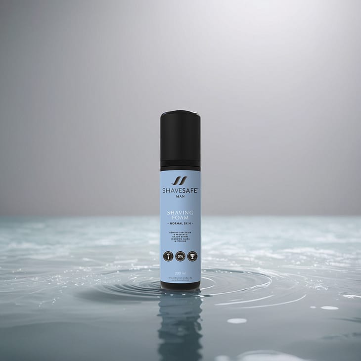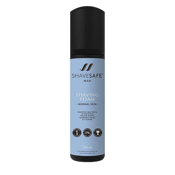 ShaveSafe Shaving Foam 200 ml Man fra ShaveSafe er en antibakteriel barberskum, udviklet specielt til mænd med sensitiv eller normal hud. Produktet er velegnet til ansigt, hals, nakke, bryst og krop – også intimt, og reducerer effektivt skægpest, rødme, barberknopper og indgroede hår.