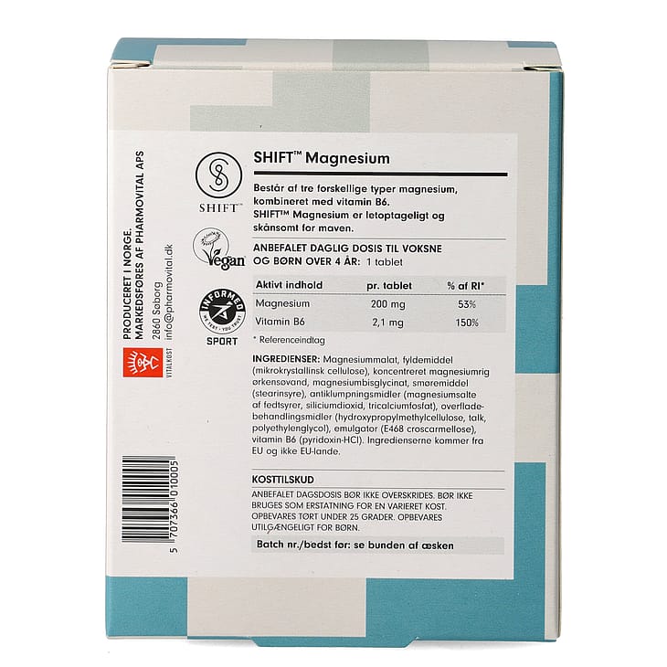 SHIFT™ Magnesium er produceret i Norge af Vitalkost AS og distribueres af Pharmovital ApS.