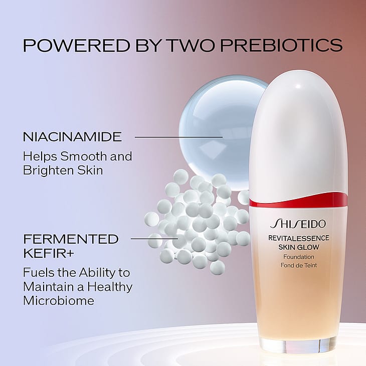 Få en strålende finish her og nu – og smukkere hud på sigt. Shiseido Revitalessence Skin Glow Foundation er en medium dækkende foundation som giver øjeblikkelig udstråling og samtidig styrker din hud, dag for dag. Allerede efter kun en uge føles huden glattere og mere klar med en synlig reducering af fine linjer¹. Formlen er beriget med Fermenteret Kefir+ og niacinamid – to effektfulde ingredienser med præbiotisk effekt, der fugter i 24 timer² og styrker hudbarrieren, samtidig med at hudens tone og tekstur forbedres. Resultatet: en jævn, naturlig base med en sund og strålende glød, også efter du har renset makeuppen af.