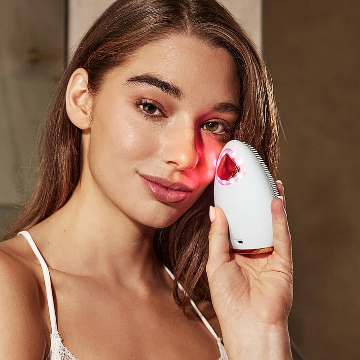 Boost din hud med LED. Begge sider af denne alsidige børste er funktionelle. Bagsiden har fire farvede LED-lys, nær-infrarød teknologi og en kølefunktion. Disse forbedrer huden ved at reducere fine linjer, hævede øjne og acne-relateret rødme. De booster også kollagenproduktionen, hvilket gør din hud fastere og strammere.