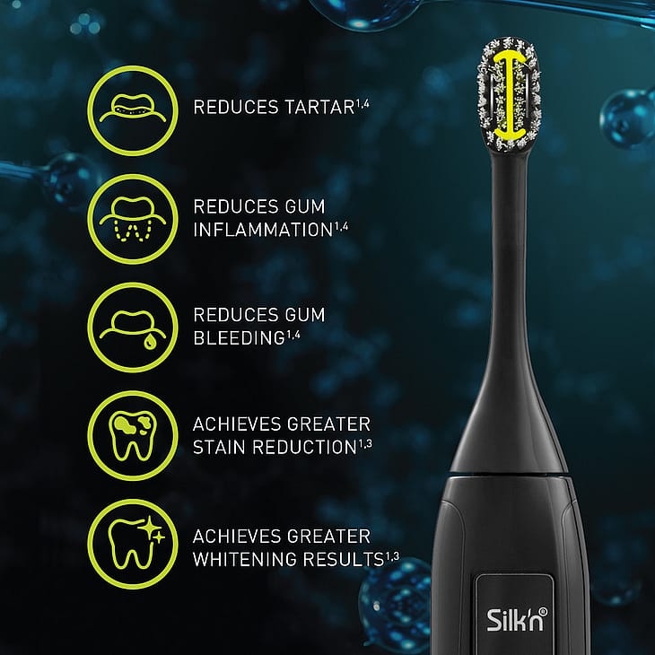 Silk’n ToothWave Videnskabsbaseret mundhygiejne. Meget mere end tandbørstning! Har du plak, misfarvninger, pletter eller tandsten på tænderne? Eller har du problemer med blødende tandkød? Så tag et kig på Silk’n ToothWave: Den revolutionerende elektriske tandbørste, der gør meget mere end nogen anden tandbørste på markedet. Køb Silk'n ToothWave og få meget mere end tandbørstning! Hvorfor Silk’n ToothWave? En elektrisk tandbørste der gør mere end bare at børste Den allerførste som arbejder med den revolutionære DentalRF™-teknologi Klinisk dokumenteret og patenteret teknologi Fjerner plak, misfarvninger, pletter og endda også tandsten Gør tænderne synligt hvidere Modvirker tandkødsblødning, tandkødsbetændelse og karies Sikrer renere og glattere tænder hele dagen En fuld opladning rækker til 2 uger Vandtæt (IP67): kan anvendes i badet Inklusive charging cradle og USB-vægadapter To børstehoveder medfølger: lille og stort Hvordan virker den? Over tid og med daglig brug kan Silk'n ToothWave give dig en bemærkelsesværdig forbedret mundhygiejne. I modsætning til andre (elektriske) tandbørster fjerner den ikke bare plak, den fjerner også misfarvninger på tænderne, pletter og selv tandsten (calculus)! Alt dette er muligt takket være den revolutionerende DentalRF™-teknologi. Silk’n ToothWave Videnskabsbaseret mundhygiejne. Meget mere end tandbørstning! Har du plak, misfarvninger, pletter eller tandsten på tænderne? Eller har du problemer med blødende tandkød? Så tag et kig på Silk’n ToothWave: Den revolutionerende elektriske tandbørste, der gør meget mere end nogen anden tandbørste på markedet. Køb Silk'n ToothWave og få meget mere end tandbørstning! Hvorfor Silk’n ToothWave? En elektrisk tandbørste der gør mere end bare at børste Den allerførste som arbejder med den revolutionære DentalRF™-teknologi Klinisk dokumenteret og patenteret teknologi Fjerner plak, misfarvninger, pletter og endda også tandsten Gør tænderne synligt hvidere Modvirker tandkødsblødning, tandkødsbetændelse og karies Sikrer renere og glattere tænder hele dagen En fuld opladning rækker til 2 uger Vandtæt (IP67): kan anvendes i badet Inklusive charging cradle og USB-vægadapter To børstehoveder medfølger: lille og stort Hvordan virker den? Over tid og med daglig brug kan Silk'n ToothWave give dig en bemærkelsesværdig forbedret mundhygiejne. I modsætning til andre (elektriske) tandbørster fjerner den ikke bare plak, den fjerner også misfarvninger på tænderne, pletter og selv tandsten (calculus)! Alt dette er muligt takket være den revolutionerende DentalRF™-teknologi. DentalRF ™-teknologien virker ved at udsende radiofrekvensbølger, der består af ladede molekyler på overfladen af hver tand og når endda også under tandkødet. Disse molekyler destabiliserer de stærke bindinger, der forbinder urenhedsmolekylerne til tandens overflade, indtil de løsnes og vaskes væk. Urenhedsmolekyler erstattes af nye uskadelige vand- og tandpasta-molekyler, som skaber et stærkt, beskyttende lag. Dette beskytter tænderne mod nye urenheder og stopper urenhederne fra at sætte sig igen. Du vil bemærke, at dine tænder forbliver rene og glatte i længere tid, selv efter du har spist. Brugen af ToothWave forhindrer opståelse af tandkødssygdomme (tandkødsbetændelse) og karies, hvilket resulterer i bedre tandpleje og et strålende hvidt smil.