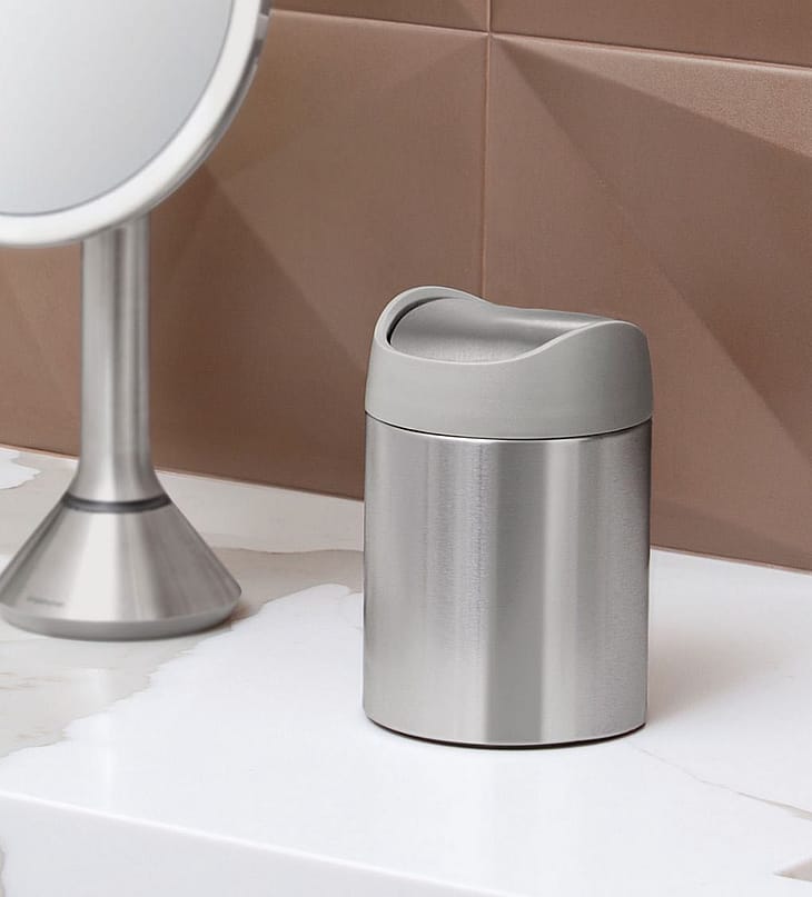 Hold styr på småtingene i hverdagen med denne smukke mini affaldsspand i børstet stål. Perfekt til badeværelset eller makeup-bordet, hvor den sikrer, at vatrondeller, makeup-rester og vatpinde altid har et diskret sted at ende.