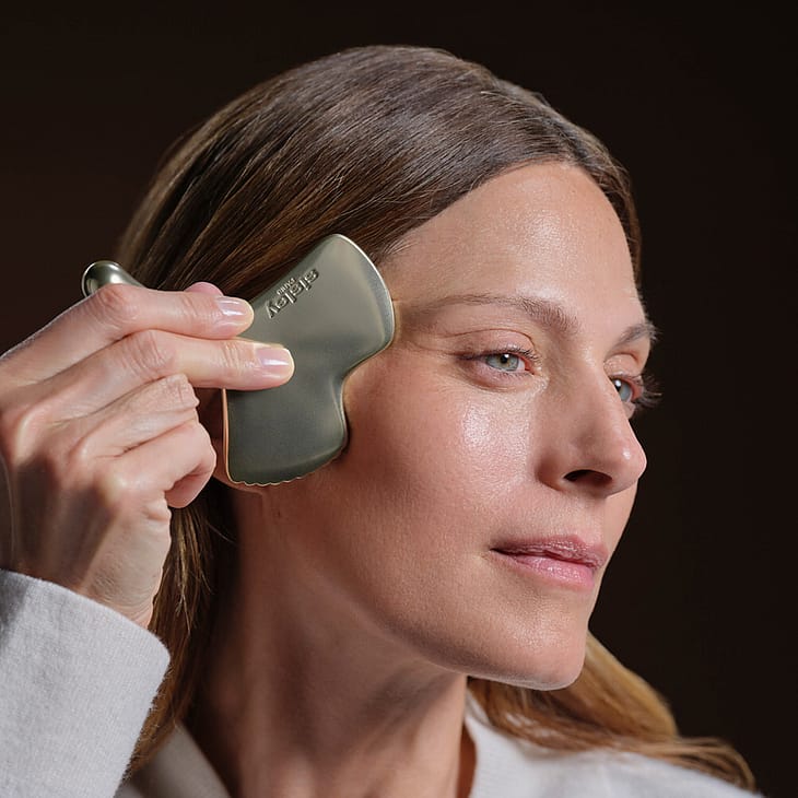 Brug den glatte kant af Gua Sha til forsigtigt at massere hele ansigtet og halsen for at fremme udjævning af huden. Ansigtstrækkene synes glattere, og huden har synligt mere glød.