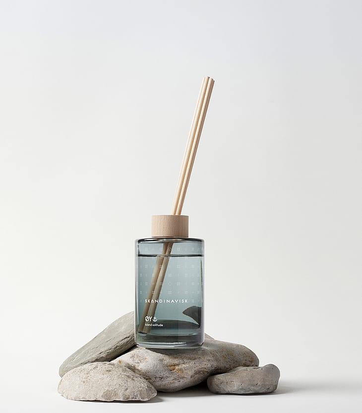 Den nye kollektion af Skandinavisk Duftpinde blander skandinaviske duft-fortællinger med vegetabilske olier leveret i en bemalet glasflaske med en dekorativ FCS-certificeret ring af birketræ.