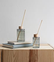 Den nye kollektion af Skandinavisk Duftpinde blander skandinaviske duft-fortællinger med vegetabilske olier leveret i en bemalet glasflaske med en dekorativ FCS-certificeret ring af birketræ.