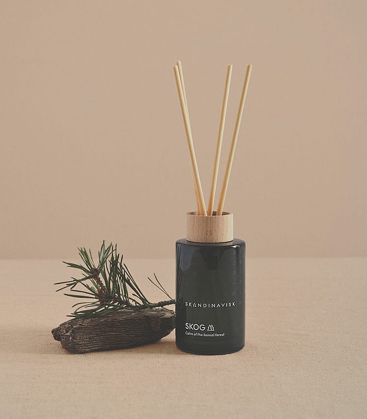 Den nye kollektion af Skandinavisk Duftpinde blander skandinaviske duft-fortællinger med vegetabilske olier leveret i en bemalet glasflaske med en dekorativ FCS-certificeret ring af birketræ.