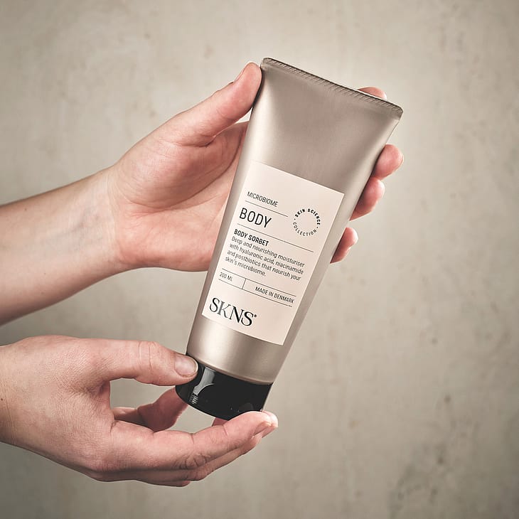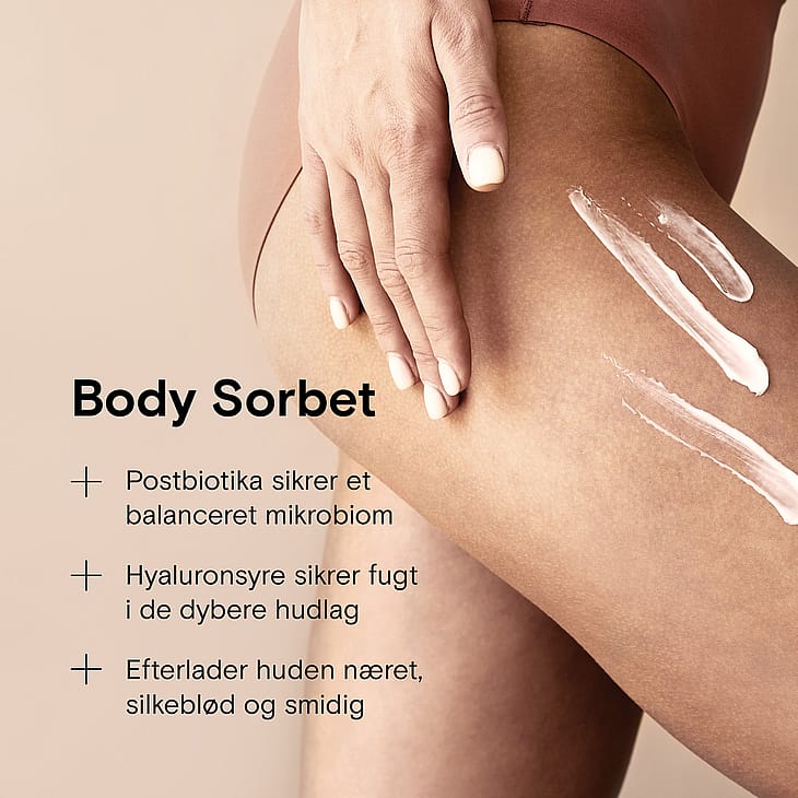 Dybdevirkende og nærende body sorbet med hyaluronsyre, niacinamid og postbiotika, der nærer din huds mikrobiom.