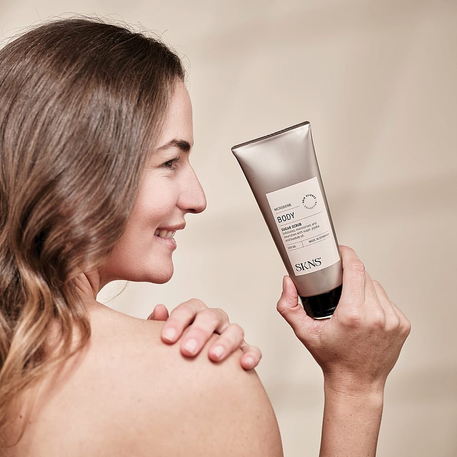 SKNS Body Sugar Scrub indeholder en blanding af nærende ingredienser, der efterlader din hud smidig og strålende.