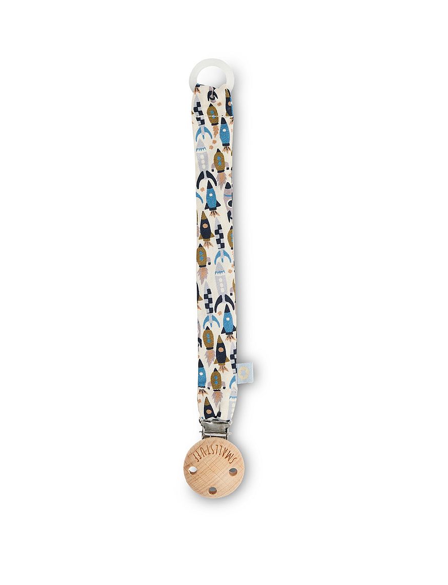 Fineste suttesnor med print i 100% bomuld med med en træ clips og gummi ring til at holde sutten.