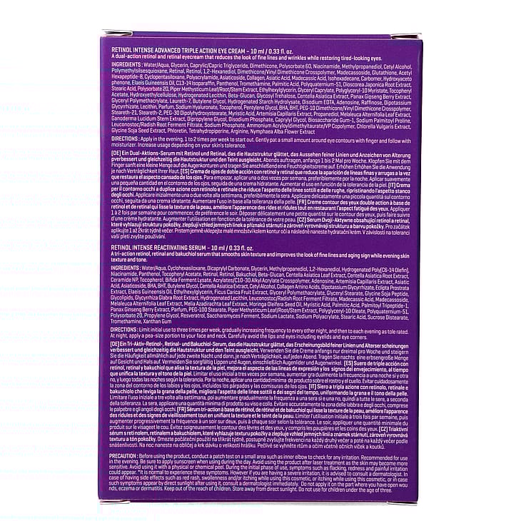 Retinol Intense Advanced Triple Action Eye Cream Water, Glycerin, Caprylic/Capric Triglyceride, Dimethicone, Polysorbate 60, Niacinamide, Methylpropanediol, Cetyl Alcohol, Polymethylsilsesquioxane, Centella Asiatica Extract, Dioscorea Japonica Root Extract, Piper Methysticum Leaf/Root/Stem Extract, Melaleuca Alternifolia (Tea Tree) Leaf Extract, Panax Ginseng Berry Extract, Artemisia Capillaris Extract, Ganoderma Lucidum (Mushroom) Stem Extract, Chlorella Vulgaris Extract, Glycine Soja (Soybean) Seed Extract, Nymphaea Alba Flower Extract, Elaeis Guineensis (Palm) Oil, Hydrogenated Lecithin, Sodium Hyaluronate, 1, 2-Hexanediol, Dimethicone/Vinyl Dimethicone Crosspolymer, Panthenol, BHT, Cyclopentasiloxane, Steareth-21, PEG-10 Dimethicone/Vinyl Dimethicone Crosspolymer, Polyacrylamide, Steareth-2, Isohexadecane, Carbomer, Hydroxyacetophenone, C13-14 Isoparaffin, Tromethamine, Palmitic Acid, Polyquaternium-51, Stearic Acid, Polysorbate 20, Retinol(0.1%), Ethylhexylglycerin, Glyceryl Caprylate, Tocopheryl Acetate, Polyglyceryl-10 Myristate, PEG-30 Dipolyhydroxystearate, Hydroxyethylcellulose, Glycosyl Trehalose, Beta-Glucan, Glyceryl Polymethacrylate, Laureth-7, Butylene Glycol, Disodium EDTA, Hydrogenated Starch Hydrolysate, Adenosine, Raffinose, Dipotassium Glycyrrhizate, Lecithin, Tocopherol, Pentylene Glycol, BHA, Myristic Acid, Tranexamic Acid, Propanediol, Dipropylene Glycol, Disodium Phosphate, Caprylyl Glycol, Collagen, Madecassic Acid, Biosaccharide Gum-1, Asiaticoside, Sodium Palmitoyl Proline, Leuconostoc/Radish Root Ferment Filtrate, Asiatic Acid, Glutathione, Retinal, Madecassoside, Sodium Phosphate, Ferulic Acid, Acetyl Hexapeptide-8, Ammonium Acryloyldimethyltaurate/VP Copolymer, Tetrahydropiperine, Phloretin, Arginine, Fragrance. Retinol Intense Reactivating Serum Water, Cyclohexasiloxane, Dicaprylyl Carbonate, Glycerin, Methylpropanediol, 1, 2-Hexanediol, Niacinamide, Hydrogenated Poly(C6-14 Olefin), Panthenol, Tocopheryl Acetate, Piper Methysticum Leaf/Root/Stem Extract, Centella Asiatica Extract, Panax Ginseng Berry Extract, Glycyrrhiza Glabra (Licorice) Root Extract, Ficus Carica (Fig) Fruit Extract, Centella Asiatica Leaf Extract, Centella Asiatica Root Extract, Melaleuca Alternifolia (Tea Tree) Leaf Extract, Artemisia Capillaris Extract, Eclipta Prostrata Extract, Melia Azadirachta Leaf Extract, Elaeis Guineensis (Palm) Oil, Hydrogenated Lecithin, Glyceryl Stearate, Bakuchiol, Palmitic Acid, Sodium Polyacrylate, Stearic Acid, Xanthan Gum, Retinol (0.1 %), Acrylates/C10-30 Alkyl Acrylate Crosspolymer, Butylene Glycol, Dipotassium Glycyrrhizate, Adenosine, Tromethamine, Polyquaternium-51, Beta-Glucan, Cetyl Alcohol, BHT, Collagen, Myristic Acid, BHA, Leuconostoc/Radish Root Ferment Filtrate, Tocopherol, Bifida Ferment Lysate, Ceramide NP, Saccharomyces Ferment, Retinal, Asiaticoside, Glyceryl Polymethacrylate, Madecassoside, Propylene Glycol, Polyglyceryl-10 Oleate, Glycolipids, Glycine Soja (Soybean) Peptide, Resveratrol, Sucrose Distearate, Asiatic Acid, Madecassic Acid, Palmitoyl Tripeptide-1, Moringa Oleifera Seed Oil, PEG-100 Stearate, Polysorbate 20, Fragrance, Ethylhexylglycerin.