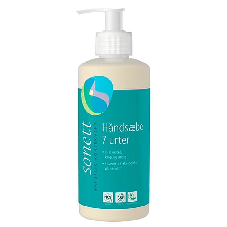 Sonett Håndsæbe 7 Urter (300 ml). Kombinationen af syv økologiske urter giver denne sæbe en helt unik, krydret duft. Velegnet til både hænder, ansigt og resten af kroppen.