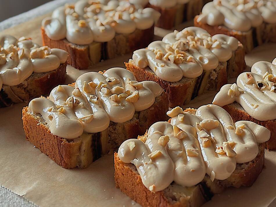 Opbevar bananbrødet på køl og pynt først med topping lige før servering.