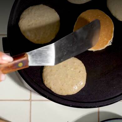 4. Hæld en lille mængde dej på panden, og steg den i 2-3 minutter på hver side, til den er gyldenbrun og fast nok til at vende. Steg på den anden side i 1-2 minutter, til pandekagen er gennemstegt.